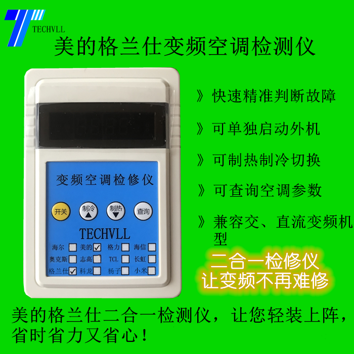 青島泰科偉業(yè)傾力打造跨品牌兼容款變頻空調(diào)測試儀檢修儀,現(xiàn)推出美的、格蘭仕二合一變頻空調(diào)檢測儀測試儀檢修儀,在美的二代的基礎(chǔ)上升級為美的、格蘭仕通用款檢測儀,一個檢測儀可以檢測美的、格蘭仕兩種品牌的變頻空調(diào),對各品牌空調(diào)自動識別,不用人為設(shè)置,操作簡單,可以精準(zhǔn)檢測故障,可以查詢空調(diào)參數(shù),可以一鍵單獨啟動外機,是變頻空調(diào)維修神器,你值得擁有!